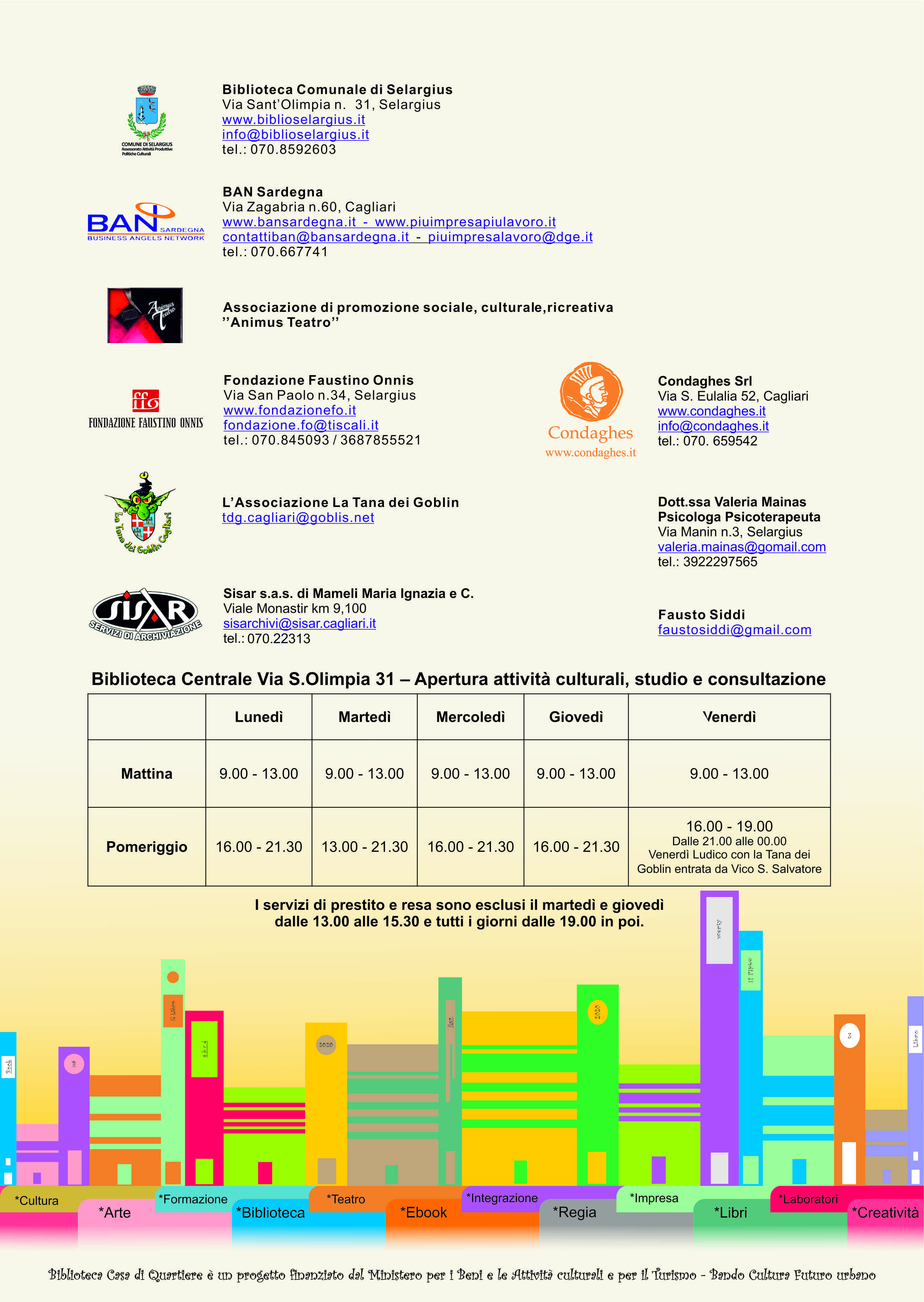 Per informazioni e iscrizioni rivolgersi alla Biblioteca Comunale - Via Gallus 2 - Piazza Si e Boi - Selargius Tel. 070842643 - mail info@biblioselargius.it